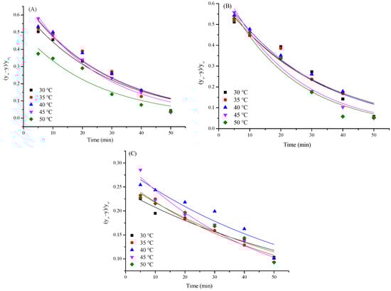 The relationship between (y∞ − y)/(y∞) and t under different temperatures ((A): UAE, (B): UE, (C): EE).