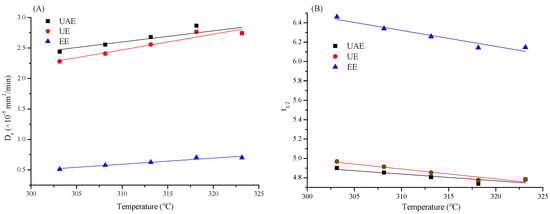 The relationship the relationship between the Ds and temperature (A) and between t1/2 and temperature (B) in three extraction process of TFP.