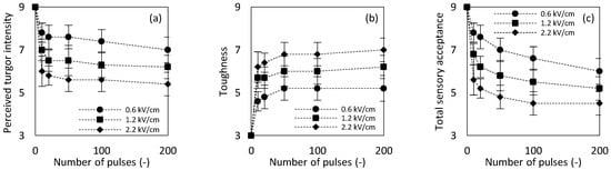 Dependence of (a) perceived turgor intensity, (b) toughness, and (c) total sensory acceptance of spinach on the number of pulses after PEF treatment at 0.6, 1.2, and 2.2 kV/cm. Markers indicate experimental data points.