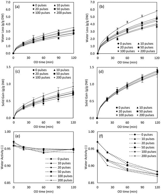 Evolution of water loss (WL) * of spinach samples during OD at (a) 50% w/w and (b) 60% w/w glycerol, solid gain (SG) * at (c) 50% w/w and (d) 60% w/w glycerol, and water activity (aw) at (e) 50% w/w and (f) 60% w/w glycerol. markers indicate experimental data points. Straight lines correspond to the fitting of the penetration model (Equation (3)) to the experimental data.