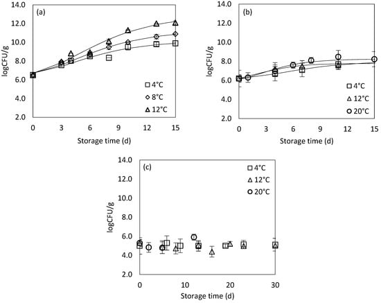 Evolution of microbial load (total viable count) at different storage temperatures for (a) untreated, (b) OD-treated, and (c) PEF-OD-treated spinach samples. Markers indicate experimental data points. Straight lines represent fitting of the Gompertz model (Equation (5)) to the experimental data.