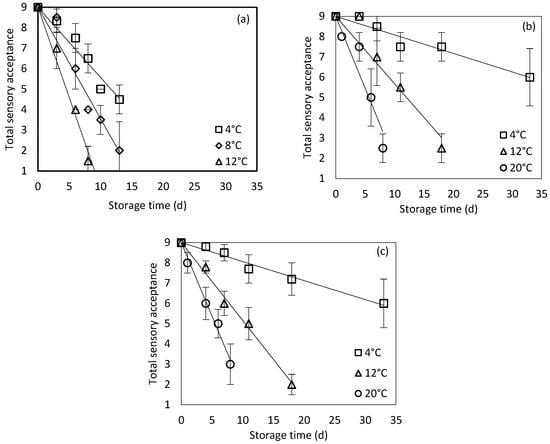 Evolution of the overall sensory acceptance during storage at various temperatures (4, 8, 12, and 20 °C) for (a) untreated, (b) OD-treated, and (c) PEF-OD-treated spinach leaves. Markers indicate experimental data points. Straight lines correspond to the fitting of Equation (6) to the experimental data.