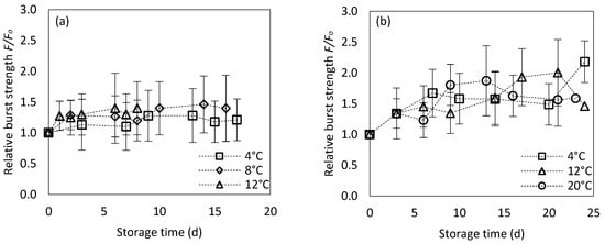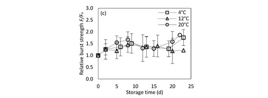 The evolution of the relative burst strength of the untreated, OD-treated, and PEF-OD-treated spinach samples at different storage temperatures is presented in Figure 5. For all treatments, it was observed that the burst strength of the spinach leaves increased with storage time. This effect was more pronounced when an OD treatment was performed, with the relative burst strength of the treated leaves almost doubling after 25 days of storage. Macroscopically, this can manifest as an increased elasticity and gumminess of the leaves, which was confirmed by the sensory evaluation of the samples. Due to the loss of water during storage (untreated samples) or dehydration (OD-treated samples), the fibers in the plant tissue became compacted, leading to an increased mechanical strength of the tissue []. Additionally, no noticeable differences in burst strength were observed between the treatments. This is a positive result since OD and PEF did not lead to texture degradation in the final product.