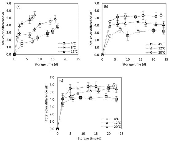 Evolution of the total color difference ΔΕ calculated with the untreated sample at time 0 as a reference for (a) untreated, (b) OD-treated, and (c) PEF-OD-treated spinach samples with respect to storage time at all storage temperatures studied (4, 8, 12, and 20 °C). Markers indicate experimental data points.