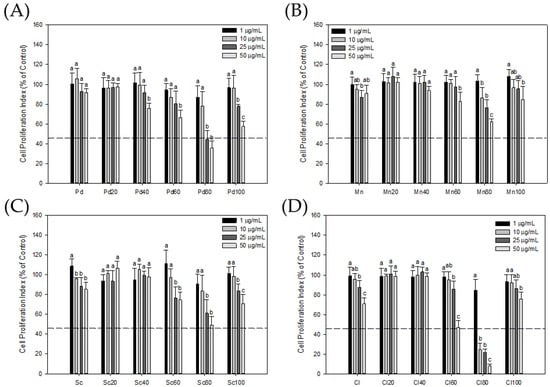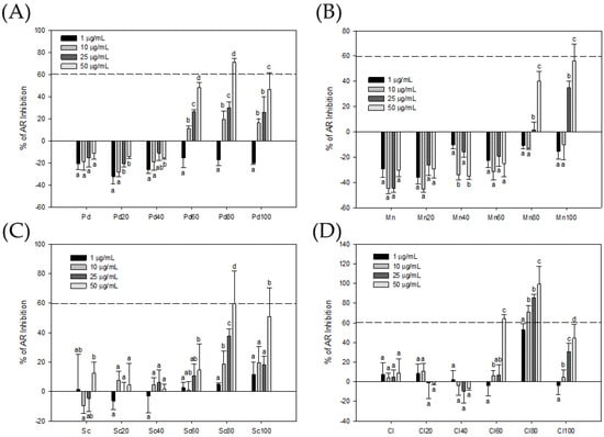 Bioactivity-guided fractions of AR inhibitors in crude extract (Pd) and MPLC fractions (Pd20, Pd40, Pd60, Pd80, and Pd100) of P. dentata Kjellman (A); crude extract (Mn) and MPLC fractions (Mn20, Mn40, Mn60, Mn80, and Mn100) of M. nitidum Wittrock (B); crude extract (Sc) and MPLC fractions (Sc20, Sc40, Sc60, Sc80, and Sc100) of S. cristaefolium C.Agardh (C); and crude extract (Cl) and MPLC fractions (Cl20, Cl40, Cl60, Cl80, and Cl100) of C. lentillifera J.Agardh (D). Each value presents the mean ± SD of three independent experiments. Different letters indicate significant differences (p < 0.05) between different concentrations in different samples.