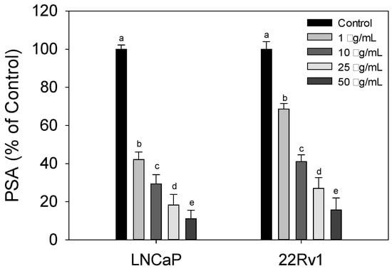 The cells were seeded in a 96-well plate with RPMI 1640 medium containing 5% charcoal-coated dextran-stripped fetal bovine serum for 24 h and then treated with different doses of seaweed extracts or fractions and 1 nM DHT. After the treatment for 24 h, the PSA levels in the cell culture supernatant were quantified using a commercial human KLK3/PSA Immunoassay kit (R&D Systems, Minneapolis, MN, USA) as directed by the manufacturer [20].