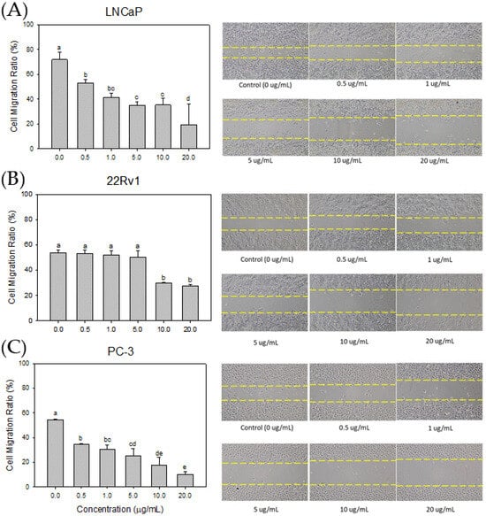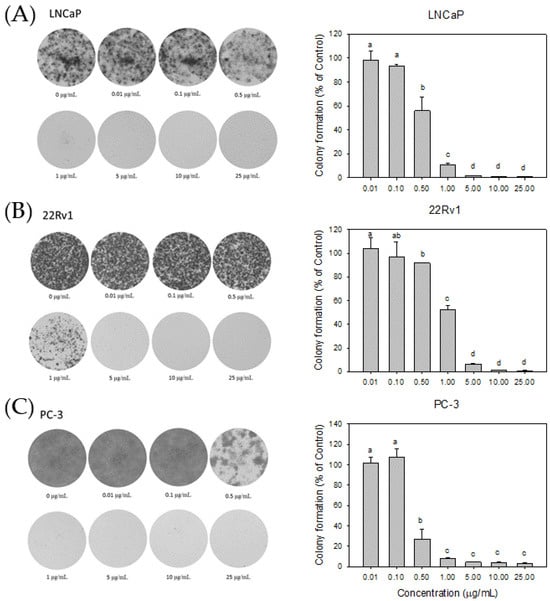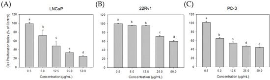 Cl80 inhibited the viability of LNCaP (A), 22Rv1 (B), and PC-3 (C) cells. The cell viability of PCa cells treated with Cl80 exhibited a significant decrease in a dose-dependent manner. The data are presented as the mean ± SD of three independent experiments. Different letters indicate significant differences (p < 0.05).