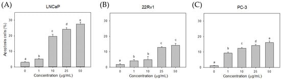 Effects of Cl80 on apoptosis of LNCaP (A), 22Rv1 (B), and PC-3 (C) prostate cancer cells. The data are presented as the mean ± SD of three independent experiments. Different letters indicate significant differences (p < 0.05).