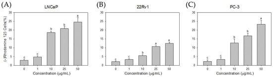 Effects of Cl80 on mitochondrial membrane potential of LNCaP (A), 22Rv1 (B), and PC-3 (C) prostate cancer cells. The data are presented as the mean ± SD of three independent experiments. Different letters indicate significant differences (p < 0.05).