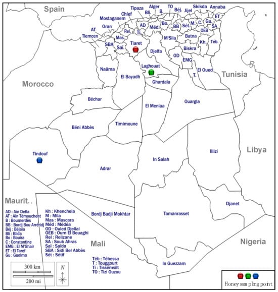 Laghouat and Tiaret are two of the most famous Algerian regions for their production of honey [23]. Laghouat is an ancient oasis in the southern foothills of the Saharan Atlas, characterized by the presence of flora very similar to that present in Mediterranean regions [24]. Tiaret is situated in the western steppe region of Algeria, and, in the north, there are dense forest areas that contain many different species of plants [25]. Tindouf, located in the natural region of the Sahara Desert, is characterised by the low diversity and abundance of plant species due to the extreme environmental conditions [26]. Figure 1 shows the geographical map of the sampling sites considered for the study.
