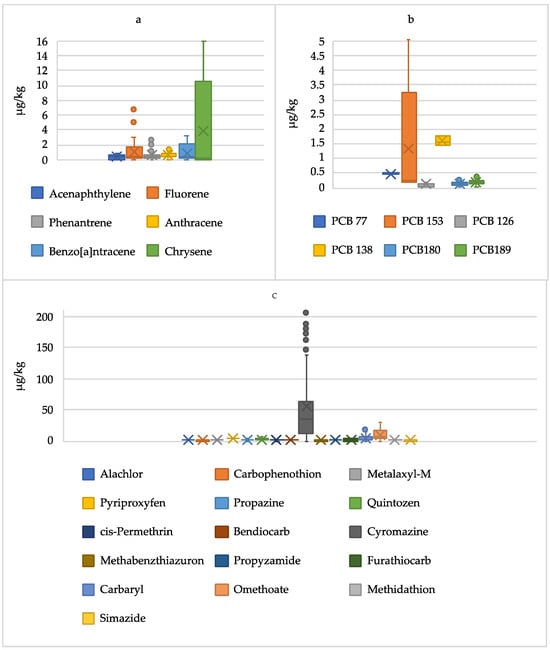 Box-plots of PAH (a), PCB (b), and pesticide (c) concentrations found in Algerian honey.