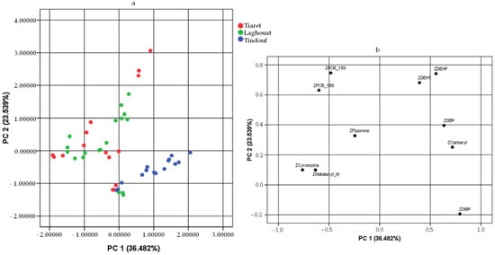 Score plot (a) and loading plot (b) of PC1 and PC2, explaining honey samples differentiated by geographical origin. For the analysis, only the data on 10 contaminants detected in at least 60% of the samples were considered.