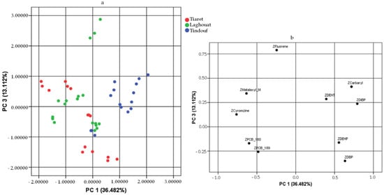Score plot (a) and loading plot (b) of PC1 and PC3, explaining honey samples differentiated by geographical origin. For the analysis, only the data on 10 contaminants detected in at least 60% of the samples were considered.
