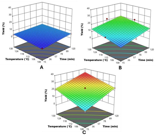 Response surfaces for the cutin yield achieved upon conventional extraction process from tomato peels as a function of hydrolysis time and temperature and for different NaOH concentrations: (A) 1% NaOH, (B) 2% NaOH, and (C) 3% NaOH.
