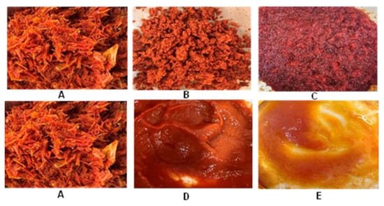 Images of untreated, HSM-treated, and HPH-treated tomato peels before and after alkaline hydrolyses (T = 130 °C, t = 120 min, 3% NaOH). (A) Untreated tomato peels, (B) HSM-treated tomato peels, (C) non-hydrolyzable residue after alkaline hydrolysis from HSM-treated tomato peels, (D) HSM-HPH-treated tomato peels, and (E) non-hydrolyzable residue after alkaline hydrolysis from HSM-HPH-treated tomato peels.