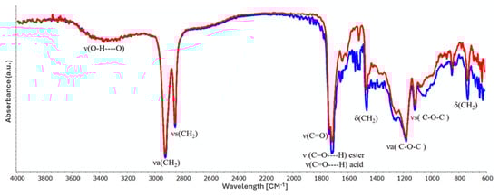 FT-IR absorbance spectra of cutin extracts obtained by conventional (blue line) and HPH-assisted (red line) extraction methods.