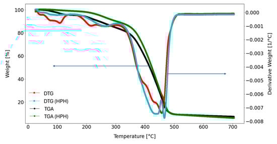 TGA provides insights into thermal stability and compositional alterations by tracking the weight loss against temperature variations, while differential thermogravimetry (DTG) offers details on the rates and precise temperatures of these changes. In the presented thermogravimetric profiles (Figure 5), both untreated and HPH-treated cutin samples exhibited similar multiple stages of weight loss, typically around five, consistent with the characteristic behavior often observed during surface evaporation for surface biomass-derived samples [2]. The initial weight loss observed (below 100 °C) in the DTG profiles of both samples was attributed to the presence of water [18]. Subsequent losses (around 120–150 °C) suggested water adsorption by hydroxyl cutin groups, which functioned as sites for coordinating water molecules. This observation was supported by the presence of hydrogen-bonded hydroxyl bands confirmed in the FT-IR analysis (Table 4). This unique characteristic of cutin may be explained by the plasticizing effect of the absorbed water [18]. However, the remaining peaks in the DTG curve did not directly correlate with the humidity levels of the samples. Both cutin samples from conventional and HPH-assisted extraction from tomato peels exhibited thermal stability up to approximately 200 °C, with less than 5% weight loss according to the TGA graph. This weight loss corresponds to the release of physical and chemical water within the cutin samples [33]. The peaks observed between 200 and 320 °C corresponded to processes such as decarboxylation and dehydration/esterification involving hydroxylated fatty acids [14,18], as well as cellulose in the sample, which was related to non-hydrolyzable cutin composition [2]. Subsequent secondary decomposition stages (between 360 °C and 475 °C) occur in multiple steps, constituting approximately 90% of the overall weight loss. This behavior is typical of complex biomass-derived samples composed of diverse mixtures of hydroxy acids [2]. The final stage of decomposition, similar to the stepwise decomposition pattern observed in estolides derived from acid oils, may be attributed to the fragmentation of the aliphatic chain of fatty acids with varying long chains or their oligomers [2,14,34].