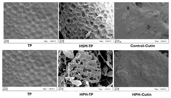 SEM images at 1000× magnification depicting tomato peel as received (TP), HSM-treated tomato peels (HSM-TP), HPH-treated tomato peels (HPH-TP), and cutin obtained through conventional extraction (control-cutin), and HPH-assisted extraction (HPH-cutin).