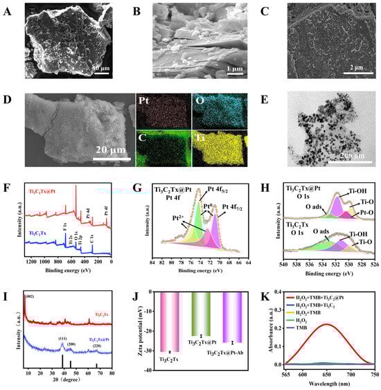 Characterization of Ti3C2Tx@Pt. SEM image of (A) Ti3AlC2 MXene, (B) Ti3C2Tx and (C) Ti3C2Tx @Pt nanocomposites. (D) EDS spectra of Ti3C2Tx @Pt nanocomposites. (E) TEM image of Ti3C2Tx @Pt. High-resolution XPS spectra of (F) Ti3C2Tx @Pt and Ti3C2Tx, (G) Pt 4 f and (H) O 1s. (I) XRD spectra of Ti3C2Tx and Ti3C2Tx@Pt nanocomposites. (J) Zeta potentials of Ti3C2Tx, Ti3C2Tx @Pt and Ti3C2Tx @Pt-Abs. (K) UV-vis absorption spectra of various solutions.