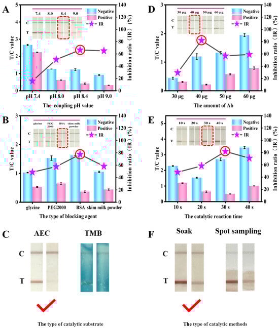 The catalytic reaction time determined the effect of the signal amplification and detection sensitivity [42]. The test strip was soaked in an AEC/H2O2 solution and recorded the T-line color intensity from 10 to 40 s, respectively. As shown in Figure 2D, as the soaking time increased, the color intensity in the T-line became progressively stronger, but the inhibition effect was the best at 30 s. Thus, the optimal catalytic reaction time was chosen to be 30 s.