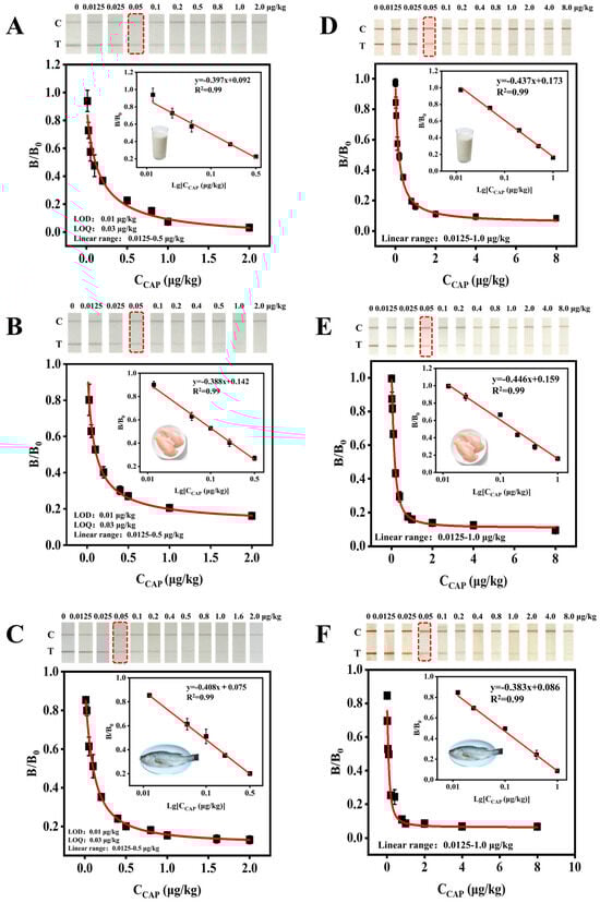 Different concentrations of CAP were added to the samples, and each sample was tested three times to obtain the visual limit of detection (vLOD), limit of detection (LOD), the limit of quantitation (LOQ) and linear detection range. The vLOD was the lowest CAP concentration at which the T-line color intensity was weaker than the C-line color intensity. The Ti3C2Tx@Pt-ICA is based on the principle that the target and the coating Ag compete to bind limited Ab probes; the color intensity of the T-line is inversely proportional to the concentration of the target (Scheme 1B). The calibration curves were exported by plotting the logarithm of CAP concentration as the X-axis and B/B0 as the Y-axis (B0 represents the T/C value of negative samples; B represents the T/C value of positive samples). The LOD and LOQ are defined as the mean of 20 blank samples plus 3 or 10 times the standard deviation (SD). The IC20-IC80 of the calibration curve is the linear detection range.