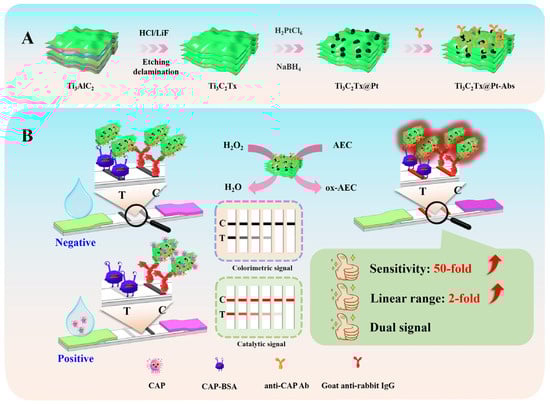 LiF (98%), Ti3AlC2 (98%), H2PtCl6·6H2O (Pt ≥ 37.5%) and 3,3′,5,5′-tetramethylbenzidine (TMB) were purchased from Macklin Inc. (Macklin, Shanghai, China). Bovine serum albumin (BSA, 98%), sodium borohydride (NaBH4) and 3-amino-9-ethylcarbazole (AEC) were bought from Sigma-Aldrich (St. Louis, MO, USA). The polyclonal Ab against CAP (anti-CAP Ab, 50 mg/mL), goat anti-rabbit IgG (17.5 mg/mL) and coating Ag (CAP-BSA, 15 mg/mL) were prepared in our lab. The sample pads (SB08, GF-2), absorbent pads (CH37K) and polyvinyl chloride (PVC) gasket (SMA31-40) were bought from Shanghai Liangxin Co., Ltd. (Shanghai, China). The nitrocellulose membrane (UniSart CN95) was obtained from Sartorius Stedim Biotech GmbH (Goettingen, Germany).