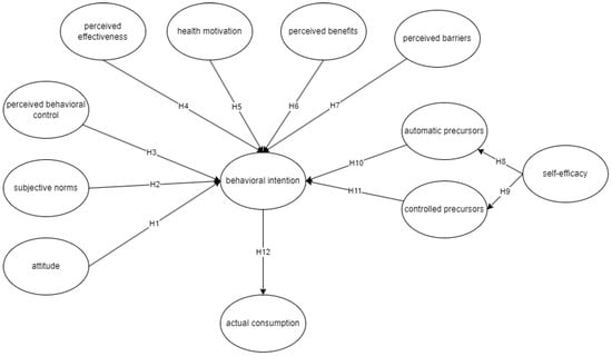 In addition, Lino et al. [35] conducted a study to investigate the attitudes and beliefs on dietary supplements among HIV-positive black women. The findings of the study indicated that perceived behavioral control is a significant predictor of intention to use dietary supplements. Similarly, Chen et al. [36] examined the effects of the perceived benefits of vitamin D supplementation intention. The results presented that the levels of intention to take vitamin D supplements were accurately predicted by factors under the TPB domains; the highest was perceived behavioral control. Pawlak et al. [37] investigated the drivers of multivitamin consumption in female Caucasian college students. Perceived behavioral control, along with attitude, were found to have a significant impact on their behavioral intentions. Thus, in this study hypothesized the following: