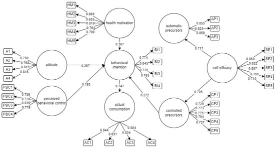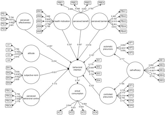 To measure factors affecting actual consumption, the Structural Equation Modeling (SEM) was applied in this study using SMART PLS v3.0. According to Ampofo and Aidoo [62], SEM is a prominently used multivariate tool for assessing the direct and indirect relationships between latent variables. The theory simplifies the relationships by constructing a path model to depict the effects resulting from the latent variables. Wathanakom [63] utilized SEM to assess the factors influencing Generation Y consumers’ vitamin and nutritional supplement purchasing intentions. The outcome of the study outlined the direct and indirect effects of the various factors, and their approach was said to be valuable to design campaigns to increase awareness about the significance of vitamins and nutritional supplements, aiding consumers in selecting the suitable supplements for purchase. In addition, Nystrand and Olsen [64] investigated the intention of consumption toward functional foods with an extended TPB model; their results enhanced insight into consumer motivation for functional food consumption and suggested potential benefits for the food industry. Moreover, the SEM results supported hypotheses related to predictors of intention and consumption frequency for functional foods, highlighting the importance of self-efficacy, attitudes, social norms, and control beliefs in consumers’ decision-making processes.