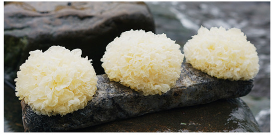 In recent years, edible mushroom polysaccharides have been shown to play a role in improving insulin resistance and inhibiting starch-digesting enzymes, in addition to possessing properties such as thickening, stabilising and gelation of non-starch polysaccharides [13]. They have been widely used to improve the pasting, rheological and digestive properties of starch [14]. Tremella fuciformis is a type of nourishing edible fungus widely cultivated in China, which contains polysaccharides, proteins, amino acids and a variety of trace elements, among which polysaccharides are the main active components (Figure 2). Tremella fuciformis polysaccharide (TP), as one of the important active components of Tremella fuciformis, possesses a wide range of processing properties, such as thickening, gelling and emulsification, which are mainly attributed to its complex structure. The structure of the linear backbone of TP consists of α-1,3-linked D-mannan residues, and the side chain is composed of α-1,3-linked D-glycan residues, while the side chains usually contain glucosyl, mannosyl, focusyl, xylosyl and glucuronide substituents, which are usually attached to the main chain [15,16,17]. In addition, TP shows a variety of physiological activities, such as antioxidant, immunity promotion, maintenance of colonic bacteria, stabilisation and assistance in lowering blood lipids [18,19,20]. The incorporation of TP into starch-based foods can utilise its functions in inhibiting starch digestion and regulating the postprandial glycaemic effect [21,22]. Therefore, it is of interest to investigate the use of edible mushroom polysaccharides to improve the processing characteristics of starch such as pasting, regeneration and rheology while slowing down the rate of starch digestion.