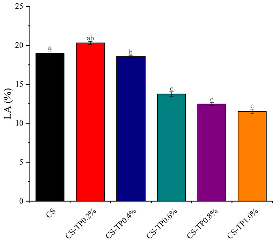 Amylose has an important role in starch pasting and regeneration, so we investigated the amount of amylose leakage (LA) during the pasting process of the composite system. When the starch granules were gelatinised, the starch granules were broken and the amylose was leached out and dissolved. The effect of different additions of TP on the amount of soluble starch leakage during the CS pasting process is shown in Figure 3. With the increase of TP addition, the difference in amylose leakage between different complexes appeared, and the trend of amylose leakage appeared to increase first and then decrease. This may be due to the fact that a small amount of TP may be bound on the surface of CS granules through hydrogen bonding and in other ways, similar to connecting hydrophilic chain segments to CS, which is conducive to the absorption of starch granules and swelling, and promotes the leaching of amylose starch. While TP significantly reduced the leaching of straight-chain starch from the CS/TP system with the elevated addition of TP (p < 0.05), the difference was not significant when the addition amount exceeded 0.6% (p > 0.05). This was due to the increase in viscosity with the addition of viscous polysaccharides such as TP, which might hinder the settling of swollen pellets during centrifugation, leading to a decrease in LA value [39], as well as enhanced intermolecular interactions between CS (mainly leached amylose) and TP through hydrogen bonding, reducing the free amylose content in the mixture [40]. Previous studies have shown similar phenomena in rice starch/hydrocolloid (xanthan gum or hydroxypropyl methylcellulose) mixtures [41].