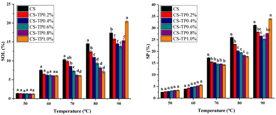 The solubility and swelling of CS at different temperatures and different concentrations of TP are shown in Figure 4. The SOL and SP of starch are related to the content of amylose and amylopectin, the ratio and the molecular weight. The swelling and solubility of starch increased with the increase in temperature. The SP and SOL of starch reflected the water-absorbing capacity of starch.