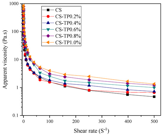 The apparent viscosity change curve of the CS/TP complex system is shown in Figure 5. The results show that the apparent viscosity of the CS/TP complex decreases with the increase of shear rate, and the pattern of change is the same for each sample. The apparent viscosity is higher at low shear, and the n value decreases significantly with the increase in shear rate, which belongs to the typical shear-thinning behaviour. At 0.1~10 s−1, the apparent viscosity decreases sharply, and the apparent viscosity tends to be stable when the shear rate is up to 100 s−1, which is a typical shear-thinning behaviour and presents a non-Newtonian fluid nature. First, the addition of TP caused the CS/TP system to show a gradual increase in the apparent viscosity compared to the single CS, a result similar to the peak viscosity results observed for the pasting process. This suggests that the addition of TP increased the apparent viscosity of CS, which was related to the thickening effect of TP and the hydrogen bonding between TP molecules and straight-chain starch molecules. This phenomenon was also found in the rheological properties of xanthan gum and tapioca starch [43].