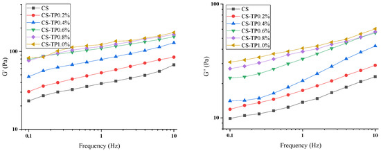 The intermolecular connections and interaction forces are usually described by dynamic rheological measurements, and the corresponding parameters include storage modulus (G′) and loss modulus (G″) to reflect the toughness and rigidity of the gel network, which is closely related to the reconstitution of the pasted starch [32]. The slurries of CS and CS/TP mixtures after the RVA procedure were cooled to 25 °C. Figure 6 shows that the G′ and G″ of all the samples increased with the increase of frequency, and the addition of TP significantly changed the dynamic modulus (G′ and G″) of the starch gels, which suggests that the addition of TP can change the structure of the starch gel and that there is a significant frequency dependence and enhanced interaction between TP and CS effect [45]. It is clear that the G′ values of all samples are always higher than the G″ values throughout the oscillation frequency range, which indicates that the elastic properties dominate the system and all samples show a typical weak gel behaviour [46]. Similar results were observed in studies of MCP–sweet potato starch [45], MCP–tapioca starch paste [47] and barley β-D glucan-wheat starch [48]. In addition, the values of G′ and G″ increased significantly (p < 0.05) with the increase of TP addition, suggesting that the viscoelasticity of CS/TP gels was enhanced by the addition of TP. This phenomenon may be attributed to the increase of intermolecular junction regions and entanglement nodes or connection tightness between molecular chains in the hybrid system, which resulted in the formation of a stronger network structure [49]. Meanwhile, our previous studies have shown that TP has good gelling and thickening abilities [50,51]. Therefore, TP can form a hydrated film on the surface of the particles which encapsulates or wraps the particles, thus enhancing the rigidity of the particles and improving the network structure of the gel, which can also explain the higher viscosity of the CS/TP composite gels in the RVA test.