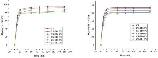 Groups of CS and CS/TP samples were prepared according to the pasting method described in Section 2.4 and lyophilised to obtain groups of lyophilised sample powders. The in vitro digestibility of each group of samples was determined as described by the previous authors with slight modifications [26,27]. In brief, 200 mg of each sample was weighed into a beaker, and 10 mL of sodium acetate buffer solution (pH 5.2, 0.2 mo/L) was added and mixed thoroughly. The samples were pasted in a water bath with magnetic stirring (95 °C) for 30 min and transferred to a water bath shaker at 37 °C to equilibrate for 10 min. Then, 10 mL of newly configured enzyme mix solution (α-amylase 200 U/mL and amyloglucosidase 160 U/mL) was added to each sample and immediately placed in a 37 °C water bath with constant shaking for treatment at 0, 20, 40, 60, 90, 120 and 180 min time points, 0.5 mL of hydrolysate was removed and 1.5 mL of 95% ethanol solution was added to inactivate the enzyme treatment. Then, the supernatant was taken after centrifugation at 5000 rpm for 10 min, and the glucose content was analysed in the supernatant by glucose oxidase–peroxidase (GOPOD) kit Glucose content, and the glucose content was determined by an enzyme marker at 510 nm. The formulae for RDS, SDS and RS content were as follows: