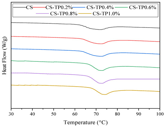 Figure 8 shows the heat flow curves of the samples when they were heated for the first time, from which it can be clearly seen that with the addition of TP, the pasting temperatures of starch, TO, TP and TC were increased to different degrees, which further illustrates that the addition of TP made the pasting of CS increasingly difficult; in fact, the pasting of the starch in the system was not sufficient but only partial. In addition, TP is very hydrophilic, and a higher addition will change the nature of water molecules in the system, especially those close to the starch granules, and restrict the motility of these water molecules, thus inhibiting the water absorption, swelling and pasting of the starch granules. The increase of the pasting temperature TO and TP of starch further indicated that after the addition of TP, a structurally stable network structure was formed in the composite system, which played a protective role for the CS crystal structure and reduced the mobility of the starch chain. It is consistent with the previous results of the pasting characteristics study.