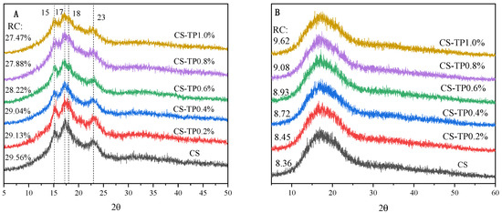 XRD is an effective method to characterise the crystal structure of starch, and the position of the diffraction angle 2θ can characterise the crystal type of starch. Different types of starch have specific diffraction peaks, which can be classified into A-type, B-type, C-type and V-type according to the ray diffraction pattern. As shown in Figure 9, CS has characteristic peaks at 15°, 17°, 18° and 23°, which is a typical A-type crystal structure [61]. Compared to unpasteurised CS, when TP was added, all samples showed strong diffraction peaks at 15°, 17°, 18° and 23°, indicating that the addition of TP did not change the A-type crystalline type of CS (Figure 9A). Moreover, the addition of TP did not affect the diffraction peaks located at 2θ in CS, indicating that TP does not interfere with the natural complex formed by starch and lipids. The addition of TP slightly decreased the crystallinity (RC) of CS. This was mainly due to the addition of TP (amorphous structure) (Figure 9A). Comparing the XRD of CS and CS/TP after pasting (Figure 9B), it is easy to find that heat pasting caused a change not only in the crystalline shape of starch but also in the width of the diffraction peaks, which indicates that pasting causes serious damage to the granular morphology of starch, damages the crystalline region of starch and inhibits the reordering of straight-chained starch. The crystallinity of unpasteurised CS was as high as 29.56, while pasting caused a significant decrease in its relative crystallinity to 8.36 (Figure 9B). With the increase of TP addition, the relative crystallinity of the CS/TP blended system increased, and it was more obvious at 1.0% addition, which was higher than that of CS by 15.7%, indicating that TP interspersed in the crevices of starch during the pasteurisation stage could play a role in protecting the crystalline structure of CS from being disrupted by the ordered structure of CS. This result is consistent with the results of FT-IR. The strengthening of the crystalline structure helps to hinder the action of digestive enzymes, which also plays a certain role in the autodigestive action of starch.