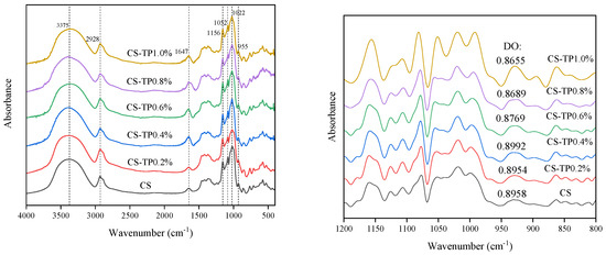 Groups of CS and CS/TP samples were prepared according to the pasting method described in Section 2.4 and lyophilised to obtain groups of lyophilised sample powders. The infrared spectral information of each group of samples was determined according to an infrared spectrometer (Nicolet iS20 spectrometer, Thermo Fisher Scientific, Waltham, MA, USA) [30]. The samples (2 mg) were ground and mixed with potassium bromide (200 mg) and then pressed and measured. The number of scans was 32, and the number of scanned waves ranged from 400 to 4000 cm−1, with a resolution of 4 cm−1. The baseline was calibrated and deconvolution processed using OMNIC 9.2 software for (800–1200 cm−1).