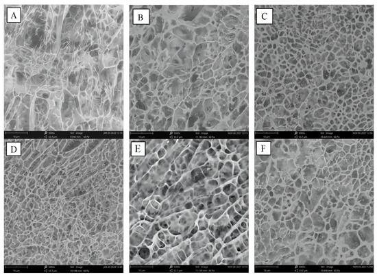 Cryo-electron microscopy (Cryo-SEM) images of CS/TP composite systems. (A) CS; (B) CS-TP0.2%; (C) CS-TP0.4%; (D) CS-TP0.6%; (E) CS-TP0.8%; (F) CS-TP1.0%.
