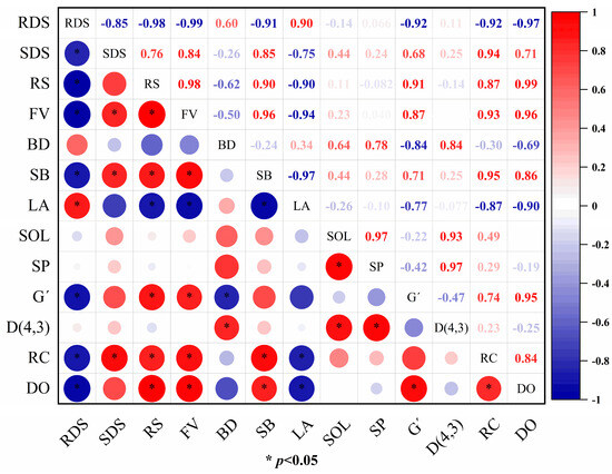 In order to better understand the relationship between the solubility, pasting properties, rheological properties, crystallinity, order and in vitro digestibility of the CS/TP composite system, we performed Pearson’s correlation analysis, and the results are shown in Figure 12. We found that the in vitro digestibility properties of the CS/TP composite system in terms of RDS showed a significant positive correlation with LA (r = 0.90, p < 0.05) and a positive correlation with BD (r = 0.60); they significantly negatively correlated with FV (r = −0.99, p < 0.05), SB (r = −0.91, p < 0.05), G′ (r = −0.92, p < 0.05), RC (r = −0.92, p < 0.05) and DO (r = −0.97, p < 0.05). While SDS was significantly positively correlated with FV (r = 0.84, p < 0.05), SB (r = 0.85, p < 0.05) and RC (r = 0.94, p < 0.05), it was only negatively correlated with LA (r = −0.75). Notably, RS content was significantly positively correlated with FV (r = 0.98, p < 0.05), SB (r = 0.90, p < 0.05), G′ (r = 0.91, p < 0.05), RC (r = 0.87, p < 0.05) and DO (r = 0.99, p < 0.05) and strongly inversely correlated with LA (r = −0.90, p < 0.05). We also found that D(4,3) was positively correlated with SP (r = 0.97, p < 0.05), SOL (r = 0.93, p < 0.05) and SB (r = 0.84, p < 0.05), respectively. The above data confirm that the addition of TP improves the viscoelasticity, crystallinity and short-range ordering of the composite gel, which is conducive to reducing starch digestibility. It is well known that postprandial glucose regulation by slowing down the rate of starch digestion to prevent diseases such as obesity and diabetes is also an effective dietary intervention management method [68].