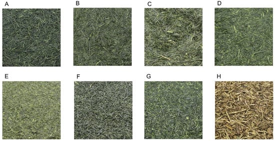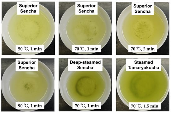 In the tea manufacturing process, Japanese green tea is first steamed or roasted to deactivate oxidative enzymes in the tea leaves [17]. Green tea made with standard steaming time is called Sencha (Figure 1B,C), whereas green tea made by steaming longer than the standard steaming time (about 60 to 120 s) is called deep-steamed Sencha (Figure 1D,E). The steamed leaves are then dried with hot air and pressure while being stirred and further dried while being shaped to form the tea. Steaming time affects the color of green tea [18]. Longer steeping reduces astringency and increases sweetness but weakens the aroma. Also, because of the long steeping process, the leaves tend to become finer and powdery during production [19]. This increases the apparent density and darkens the color of the infusion.