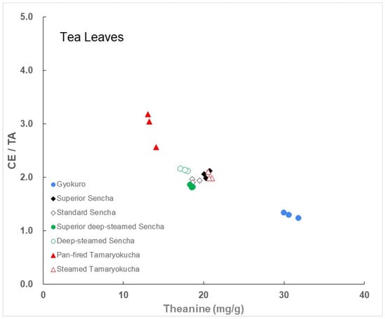 The relationship between the CE/TA ratio and theanine content for each green tea is shown in Figure 2. The results of the three measurements for each green tea are shown here. Since the CE/TA ratio of Hojicha was significantly higher than those of other green teas because amino acids such as theanine were significantly reduced through heat treatment, it was not included in this figure.