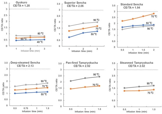 Next, we examined whether the CE/TA ratio changed with water temperature and infusion time. Figure 4 shows the change in CE/TA ratio for each Japanese green tea when the amounts of tea leaves and hot water are kept constant and the temperature of the hot water and infused time are varied. The CE/TA ratio was higher for each green tea at higher water temperatures and longer infusion times (Figure 4).