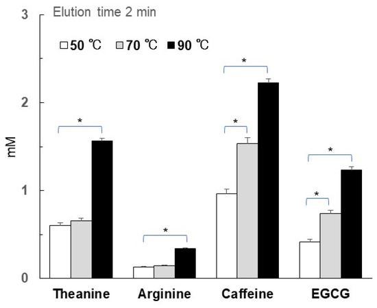 Effect of water temperature on the elution of theanine, arginine, caffeine, and EGCG in standard Sencha. A measure of 6 g of standard Sencha (CE/TA = 1.94) was infused with 260 mL of hot water at 90 °C for 2 min. Each column represents the mean ± SEM (n = 3). (* p < 0.05, Tukey–Kramer significant difference method).