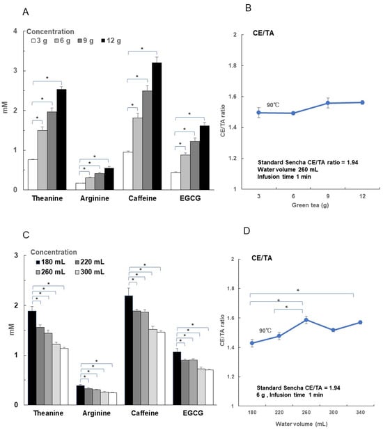 Effects of the amount of tea leaves and the infusion water volume on CE/TA ratio. A measure of 3–12 g of standard Sencha (CE/TA = 1.94) was infused with 260 mL of hot water at 90 °C for 1 min (A,B). The relationship between the concentrations of theanine, arginine, caffeine, and EGCG in the resulting infusion and the amount of tea leaves is shown in A. The relationship between the tea leaf volume and CE/TA ratio is shown in B. A measure of 6 g of standard Sencha (CE/TA = 1.94) was infused with 180–340 mL of hot water at 90 °C for 1 min (C,D). The relationship between the concentrations of theanine, arginine, caffeine, and EGCG in the resulting infusion and tea brewing water infusion volume is shown in (C). The relationship between the infusion water volume and CE/TA ratio is shown on (D). Each column and point represent the mean ± SEM (n = 3) (* p < 0.05, Tukey–Kramer significant difference method).