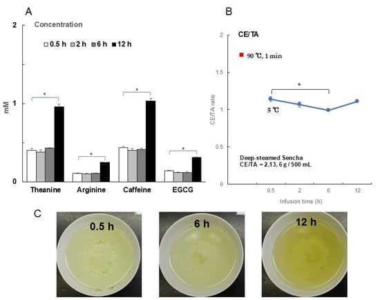 Effect of the cold-water brewing time on the CE/TA ratio of infusion. A measure of 6 g of deep-steamed Sencha (CE/TA = 2.13) was infused with 500 mL of cold water at 5 °C for 0.5–12 h. The relationship between the concentrations of theanine, arginine, caffeine, and EGCG and time (A). The relationship between the infusion time and CE/TA ratio at 5 °C. For comparison, the CE/TA ratio at 90 °C for 1 min was added (B). Photos of infused solution for 0.5, 6, and 12 h (C). Each column and point represent the mean ± SEM (n = 3) (* p < 0.05, Tukey–Kramer significant difference method).