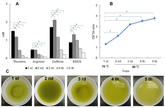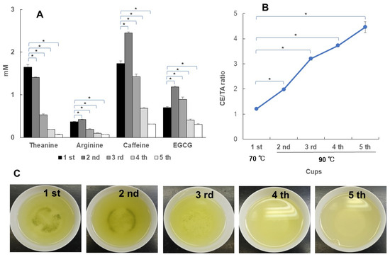 Changes in the amounts of eluting constituents and the CE/TA ratio from the first to the fifth cup. A measure of 6 g of superior deep-steamed Sencha (CE/TA = 1.82) was infused with 170 mL of hot water at 70 °C for 1 min (first cup). Next, it was infused with 170 mL of hot water at 90 °C for 20 s (second cup). The third, fourth, and fifth cups were brewed in the same manner. The relationship between the concentrations of theanine, arginine, caffeine, and EGCG and cups (A). The relationship between cups and CE/TA ratio (B). Photos of infused solution for the first to fifth cups (C). Each column and point represent the mean ± SEM (n = 3) (* p < 0.05, Tukey–Kramer significant difference method).