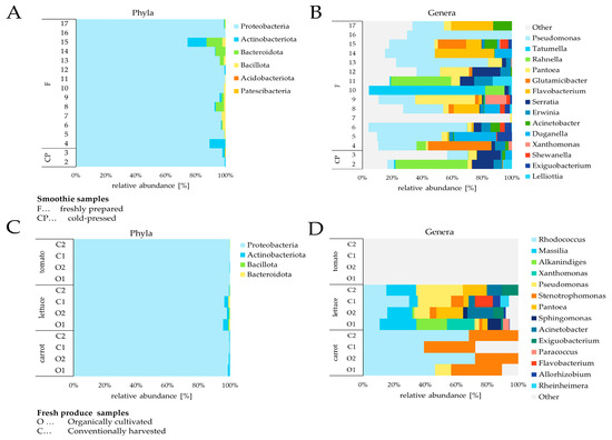 Bacterial community composition of smoothies (A phyla, B genera) and fresh produce (C phyla, D genera) represented as 100% stacked bar charts. Taxa with a relative read abundance ≥ 0.1% are displayed. The 14 most abundant genera are plotted. The remaining assigned genera are summarized under the term “Other”.