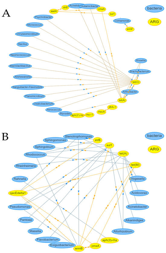 Co-occurrence network analysis of genera and absolute ARG and MGE concentrations (Spearman’s correlation coefficients ≥ 0.65) for (A) smoothies and (B) fresh produce.