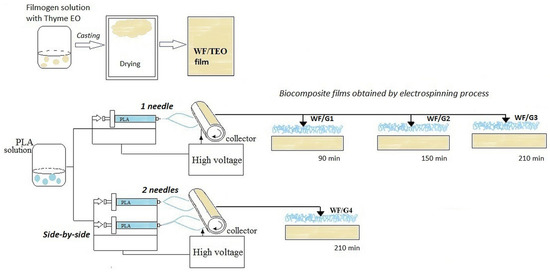 PLA pellets (10% w/w) were accurately weighed and solubilized in 3:1 chloroform- acetone mixture, under magnetic stirring, at 50 °C and 250 rpm, until a transparent viscous solution was obtained. The electrospinning process was carried out using a fiber electrospinning unit (TL-Pro-BM, Tong Li Tech, Shenzhen, China) at 22 ± 1 °C and 30 ± 5% RH. The solution was loaded in a 25 mL syringe with 19-gauge steel needle connected to the positively charged electrode. Pre-prepared whey films were previously mounted onto a collector and the PLA solution was directly fed in the form of a fibrous layer at a flow rate of 0.5 mL/h. A horizontal in-motion slider for spinneret/spinnerets with a scanning speed of 20 mm/s was used. Other electrospinning parameters included a collector rotation speed of 20 rpm and the voltage applied of (+) 15 kV, (−) 8 kV. The electrospinning parameters and system configuration were selected based on preliminary experiments performed prior to this study.