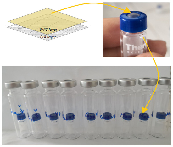 In order to establish the retention capacity of volatile compounds from TEO by the composite consisting of WF covered with PLA fiber mats of different thickness, the tested biocomposite films were mounted on a small vial lid (Figure 2) with the PLA mat oriented upwards and the WF film with TEO oriented downwards. Thus, a more clear-cut separation surface between the two vials was created, a small 2 mL glass vial and a larger 20 mL one. The WF samples were spiked with 5 μL of 2-octanol (0.651 mg/mL) used as the internal standard.